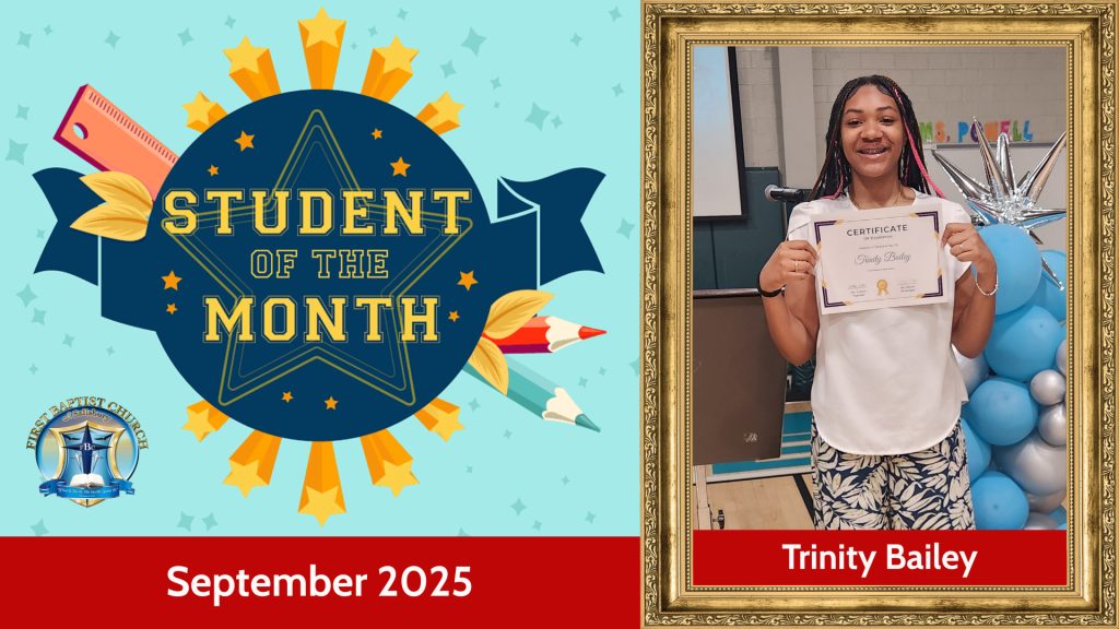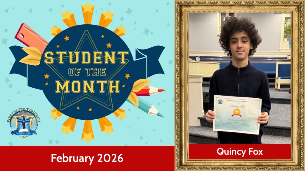 The FBC Student of the Month is chosen using the following criteria: CHARACTER, LEADERSHIP, CITIZENSHIP, and ACADEMICS (but not solely). The Student of the Month should demonstrate excellent behavior both inside and outside of the classroom. In addition, they should be well mannered and respectful to both peers and adults.